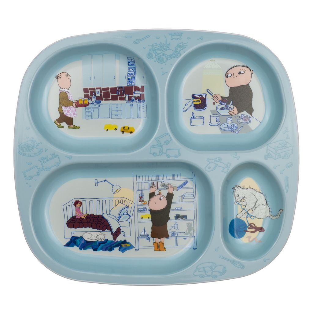 Tallriken pryds av ett charmigt motiv i mjuka blå toner, där Alfons, Pappa och katten Pussel följer med vid varje måltid. En trygg och rolig vän i barnets matäventyr!