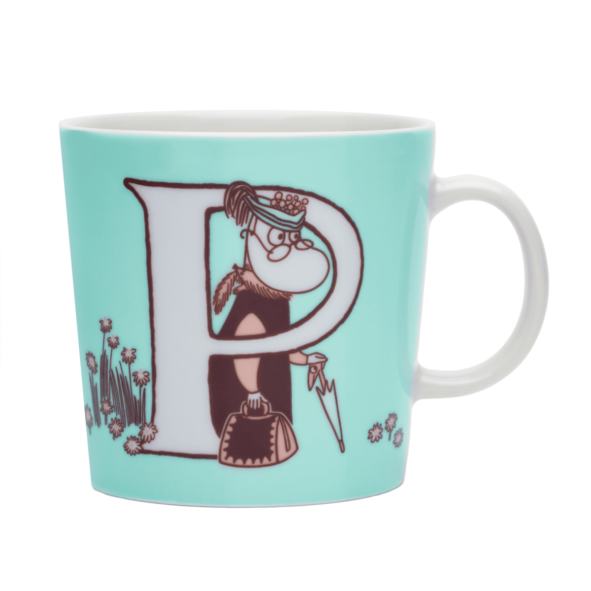 Ett måste för muminsamlaren – Muminmugg Alfabetsmugg, bokstaven P. Muggen rymmer 4 dl, och är en lite större mugg som lämpar sig för tedrickaren.
