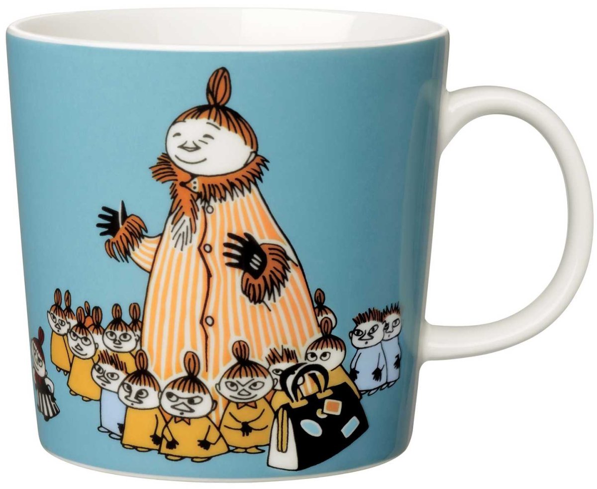 Turkos muminmugg i porslin med Mymlans Mamma och hennes barn, från Arabia. Rymmer ca 3 dl.