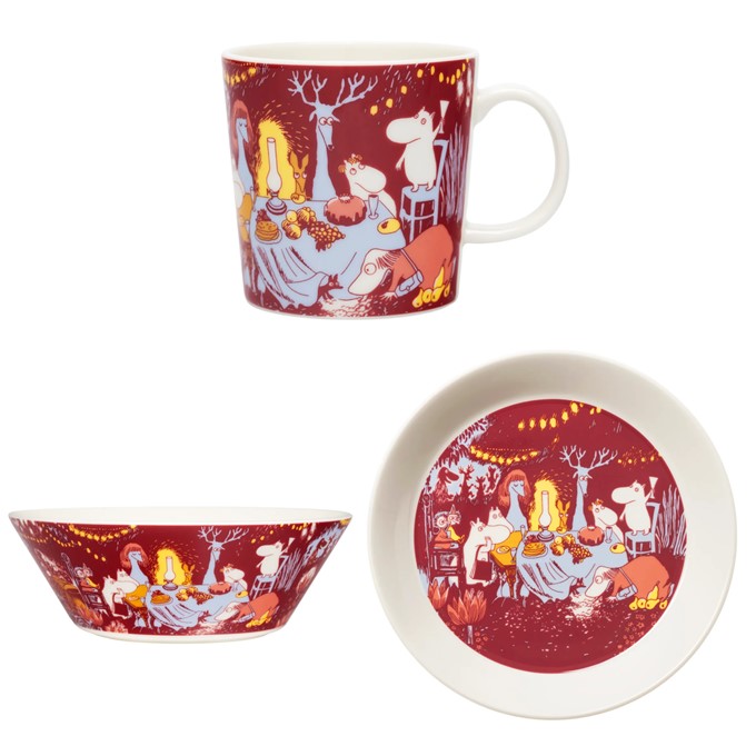 Vintrig servis i fint motiv, Festliga Stunder 2025. Ljuvlig servis med mugg, tallrik och skål, i härlig färg och fint motiv där muminfamiljen sitter samlad runt ett stort bord, delar mat och höjer en skål medan hela dalen lyser upp av eldflugor och lysmaskar. Säljs under begränsad tid.