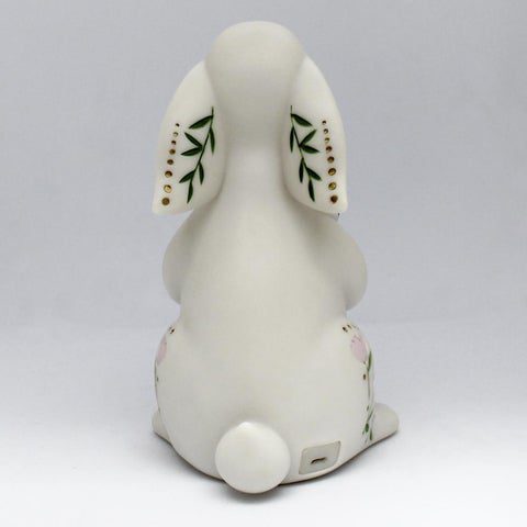 Kaninen är vit med fina detaljer i rosa, grönt och guld.