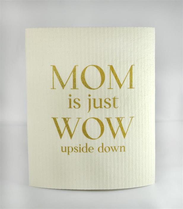 Disktrasa till alla fantastiska mammor MOM is just WOW upside down.P erfekt gå-borts-present, eller rolig detalj i ditt kök. Vit disktrasa med guldfärgad text. Det blir inte roligare att städa för att man har en fin disktrasa, men lite gladare blir man varje gång den åker fram!