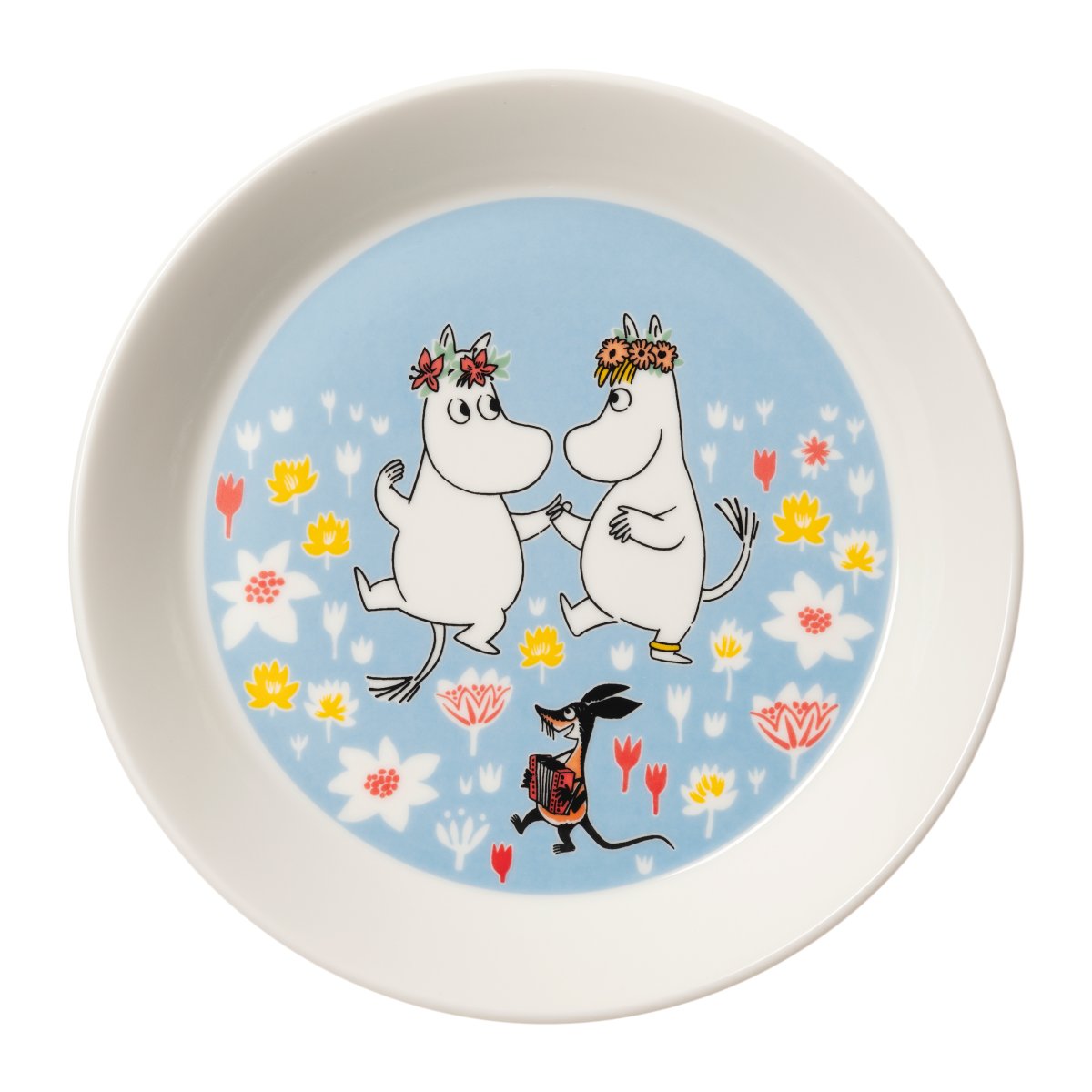 OBS Förbeställning! Planerad att inkomma till lagret andra halvan av maj, övriga produkter i samma beställning skickas vid samma tillfälle! Vacker tallrik i Sverigeexklusiv specialutgåva. Här ses Mumintrollet och Snorkfröken med blomsterkransar på huvudet i en härlig sommardans Tallrik i begränsad upplaga, säljs t.om 31-12-26, eller så långt lagret räcker. Börjar skickas från lagret 20 maj.