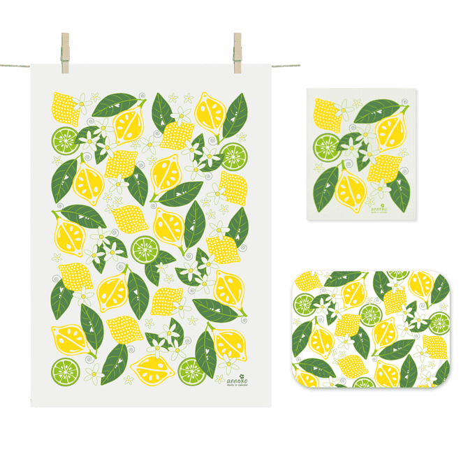 Fint set med kökshandduk, bricka och disktrasa i fint motiv med härliga citrusfrukter. Perfekt som gåborts-present, inflyttningspresent, födelsedagen eller när du själv behöver pigga upp ditt kök! Du köper gåvosetet till fint paketpris. Ordinarie pris 472 kr, du betalar 399!